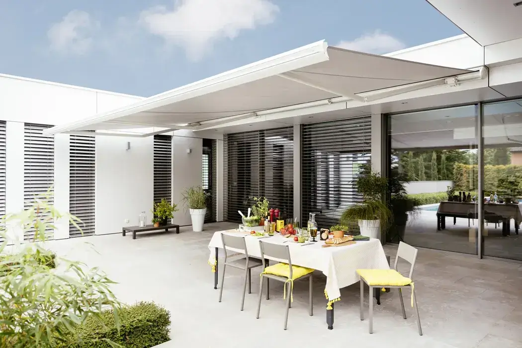 Stijlvolle buitenzonwering die comfort en functionaliteit combineert: een op maat gemaakt knikarmscherm biedt perfecte schaduw en privacy. De neutrale kleuren sluiten naadloos aan bij de architectuur – een terras om het hele seizoen van te genieten...